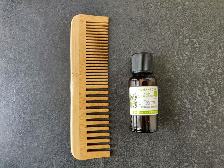 Dans un bol, mélanger deux à trois cuillères à soupe de rhassoul avec un peu d’eau jusqu’à obtenir une pâte homogène. Ajouter deux gouttes d’huile essentielle d’arbre à thé (et éventuellement une goutte de vraie lavande), mélanger, puis appliquer raie par raie sur le cuir chevelu.